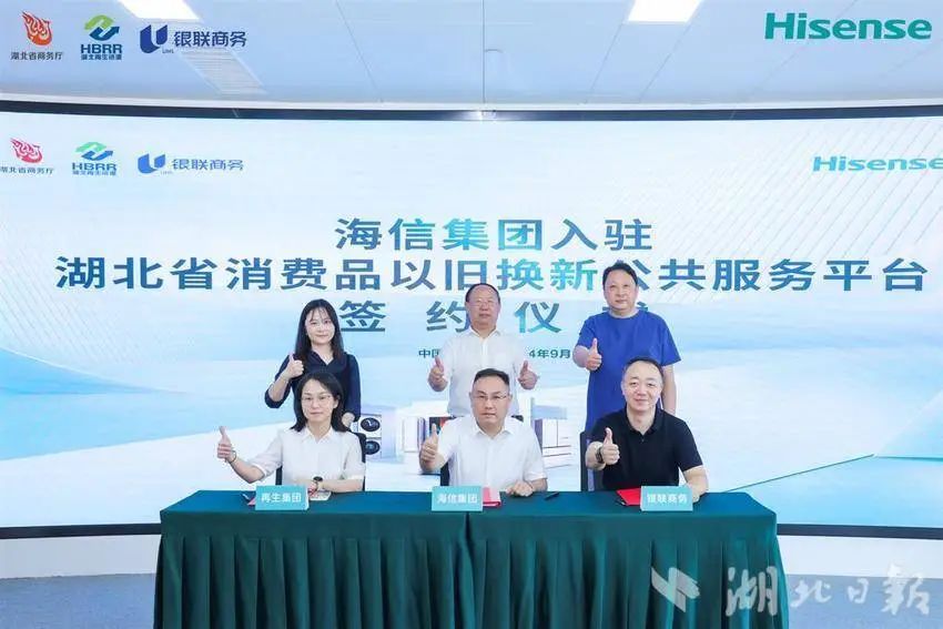 消費(fèi)者將有更多、更方便的渠道享受家電以舊換新優(yōu)惠。9月18日在湖北省商務(wù)廳指導(dǎo)下湖北省再生資源集團(tuán)有限公司銀聯(lián)商務(wù)支付股份有限公司湖北分公司海信(武漢)銷售有限公司舉行三方簽約海信集團(tuán)在湖北的1000余個(gè)銷售網(wǎng)點(diǎn)可讓更多居民在家門口以舊換新。