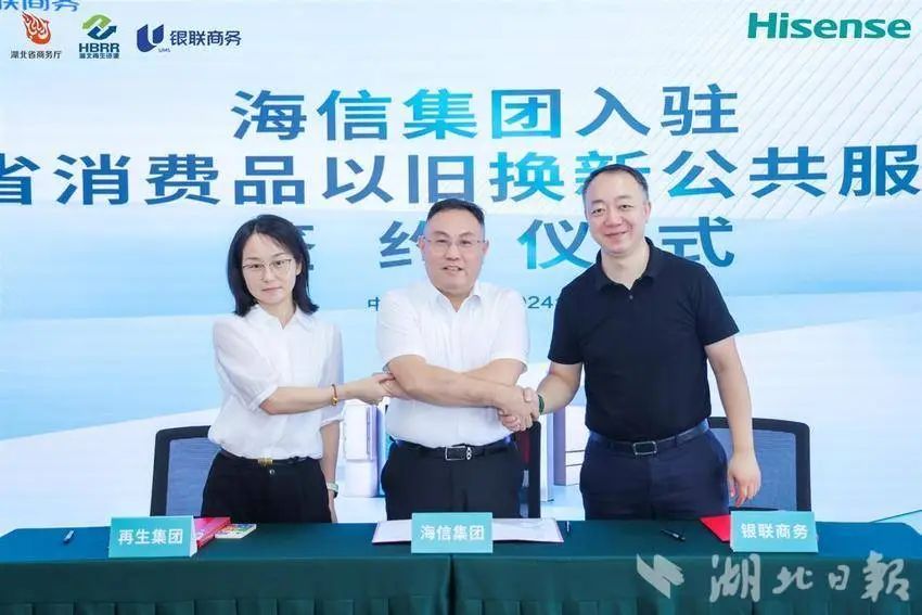 消費(fèi)者將有更多、更方便的渠道享受家電以舊換新優(yōu)惠。9月18日在湖北省商務(wù)廳指導(dǎo)下湖北省再生資源集團(tuán)有限公司銀聯(lián)商務(wù)支付股份有限公司湖北分公司海信(武漢)銷售有限公司舉行三方簽約海信集團(tuán)在湖北的1000余個(gè)銷售網(wǎng)點(diǎn)可讓更多居民在家門口以舊換新。